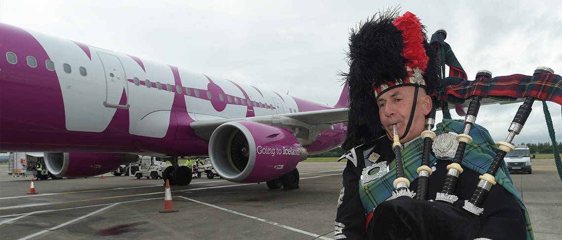 Edinburgh Airport welcomed the first WOW air flight from Iceland yesterday. Travellers arriving from the Nordic nation, as well as North America were greeted at the arrival gate by a bagpipe player, providing an authentic Scottish musical welcome.