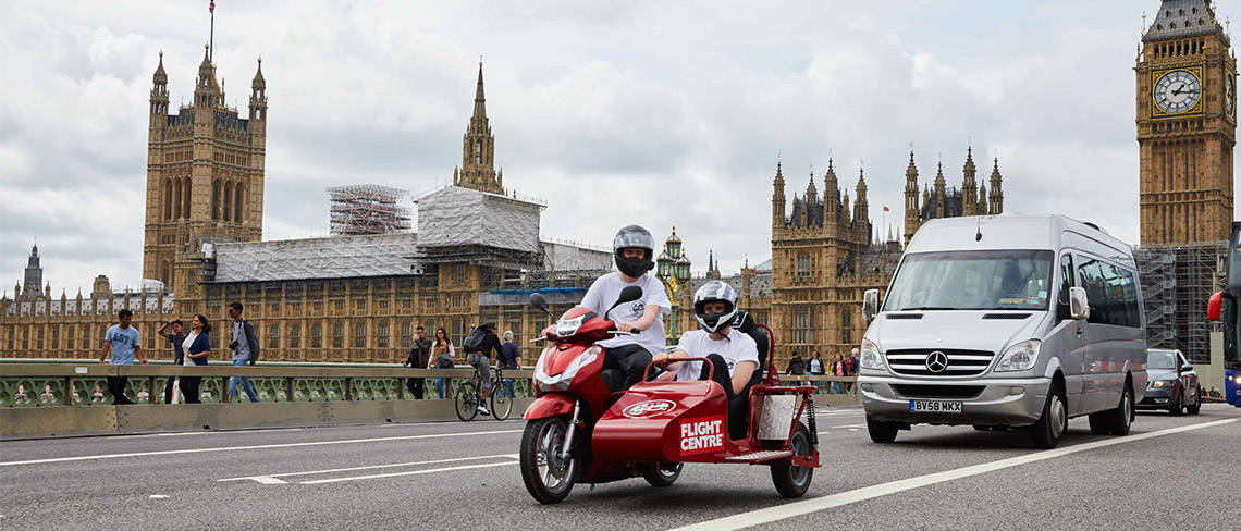 On 21 October 2017, London-based Flight Centre travel consultants Reece Gilkes and Matt Bishop will embark on the first ever circumnavigation of the globe on a scooter with a sidecar.