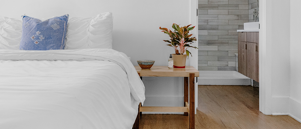 Plugged in devices and lightbulbs emit heat and contribute to the overall temperature of a room. Turning everything off is better for the environment and prevents stimulating blue light, which can make you feel more awake. Remove all laptops, screens and phones from your bedroom to avoid distraction should you wake in the night.