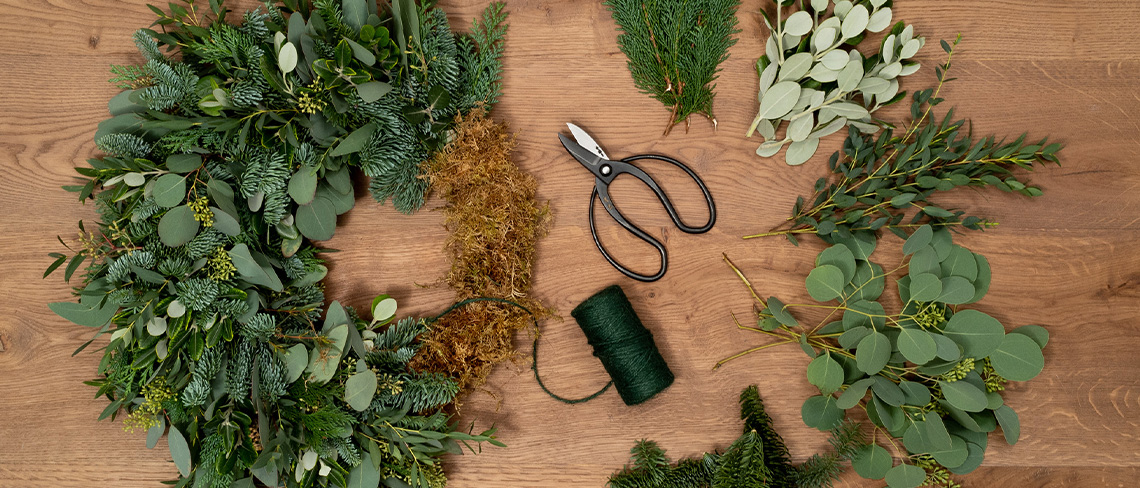 Once you know the size of wreath you’ll be making, you will need a moss ring, a good pair of scissors or secateurs, twine and floristry wires. These can be found in most garden centres.