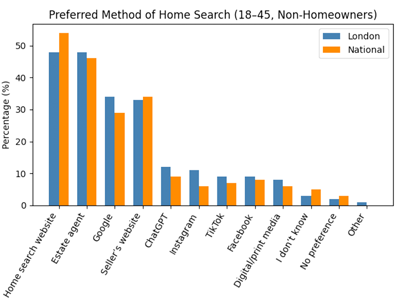 The data also showed that 11% of adults in London yet to own a home prefer to search for properties using Instagram, almost double the national average of 6%, however ChatGPT was still preferred over both Instagram and TikTok (9%) amongst Londoners.