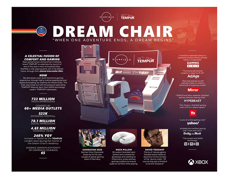 Together, Rooster & Miai (Xbox brand partnership agency) conceptualised the Starfield x TEMPUR® Dream Chair, fusing NASA-born TEMPUR® Material with the exhilarating world of gaming, in a futuristic, one-of-a-kind gaming rig.